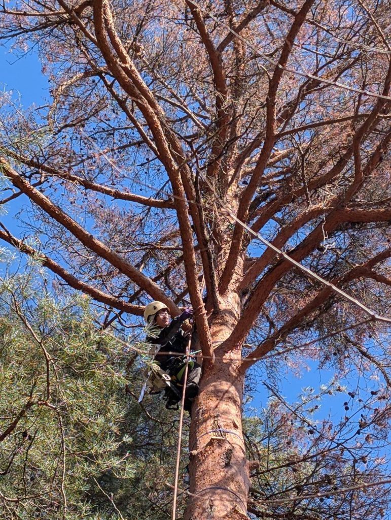 私が木に昇り、信頼する3人の庭師仲間が地上でロープを操る。一瞬の油断も許されない時間が続きました。